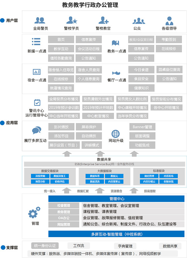 该项目是在警训中心前期项目建设的基础上,整合中心现有硬件设备,利用基础网络、教务教学管理系统,购买安装相关硬件,开发新的对接模块,建设的上海市戒毒局警官教育训练中心“一站式”平台。项目建设主要包括以下模块: